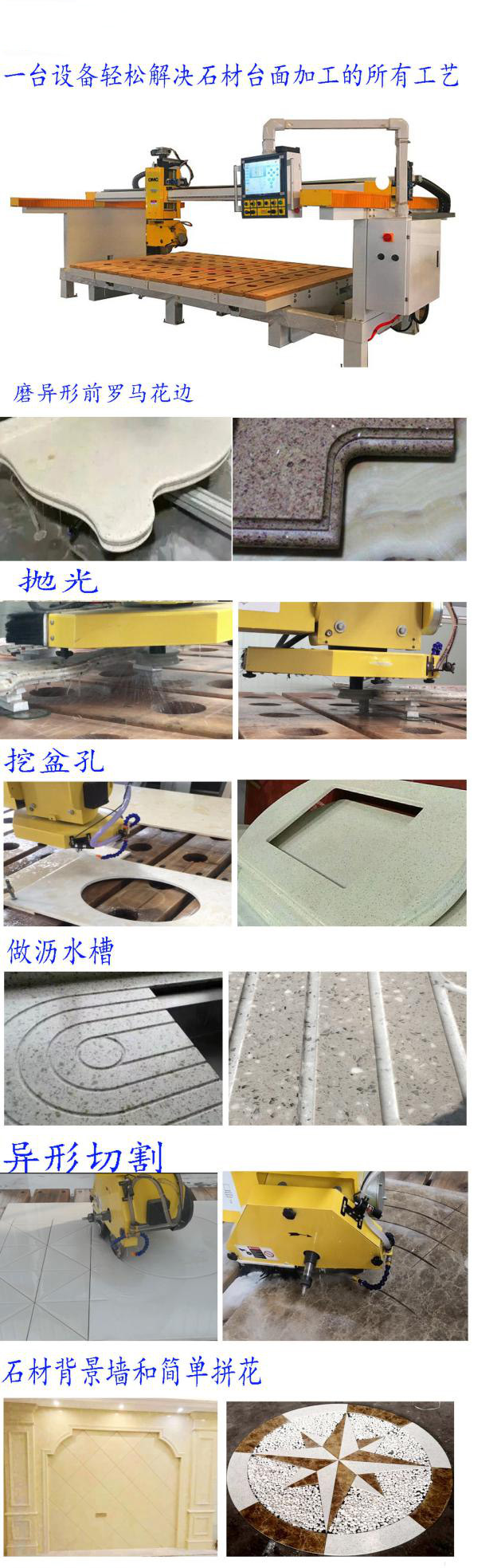人造石可分為聚酯板類和復(fù)合亞克力類。聚酯板的主要原材料是不飽和聚酯樹脂、氫氧化鋁、碳酸鈣及天然原料,色澤柔和絢麗,光澤度高,具有足夠的強(qiáng)度、硬度,可切割加工各種不同規(guī)格、形狀的臺(tái)面,而且可以做到拼接無縫,表面光滑平順,石英石櫥柜臺(tái)面磨邊機(jī),由底至面實(shí)心一體,無毛細(xì)孔,不藏污納垢,無細(xì)菌滋生、無輻射性,容易清理。聚酯板類人造石(不飽和樹脂+填充料)是為常用的人造石。復(fù)合亞克力類是一種復(fù)合而成的高分子產(chǎn)品,除了具有聚酯板類人造石的一切特點(diǎn)外,質(zhì)感更細(xì)膩,抗老化性能、硬度、光亮度和搞彎曲變形性能更優(yōu)異。優(yōu)點(diǎn)是容易造型,接駁無縫,容易拋光打磨,缺點(diǎn)是表面易磨損,全自動(dòng)櫥柜臺(tái)面磨邊機(jī),易滲色,易開裂。但是人造石的硬度就不及石英石了,大理石櫥柜臺(tái)面磨邊機(jī),而且熔點(diǎn)也不能超過200攝氏度,所以要注意保養(yǎng),而且相對更容易被油污、色漬滲透。